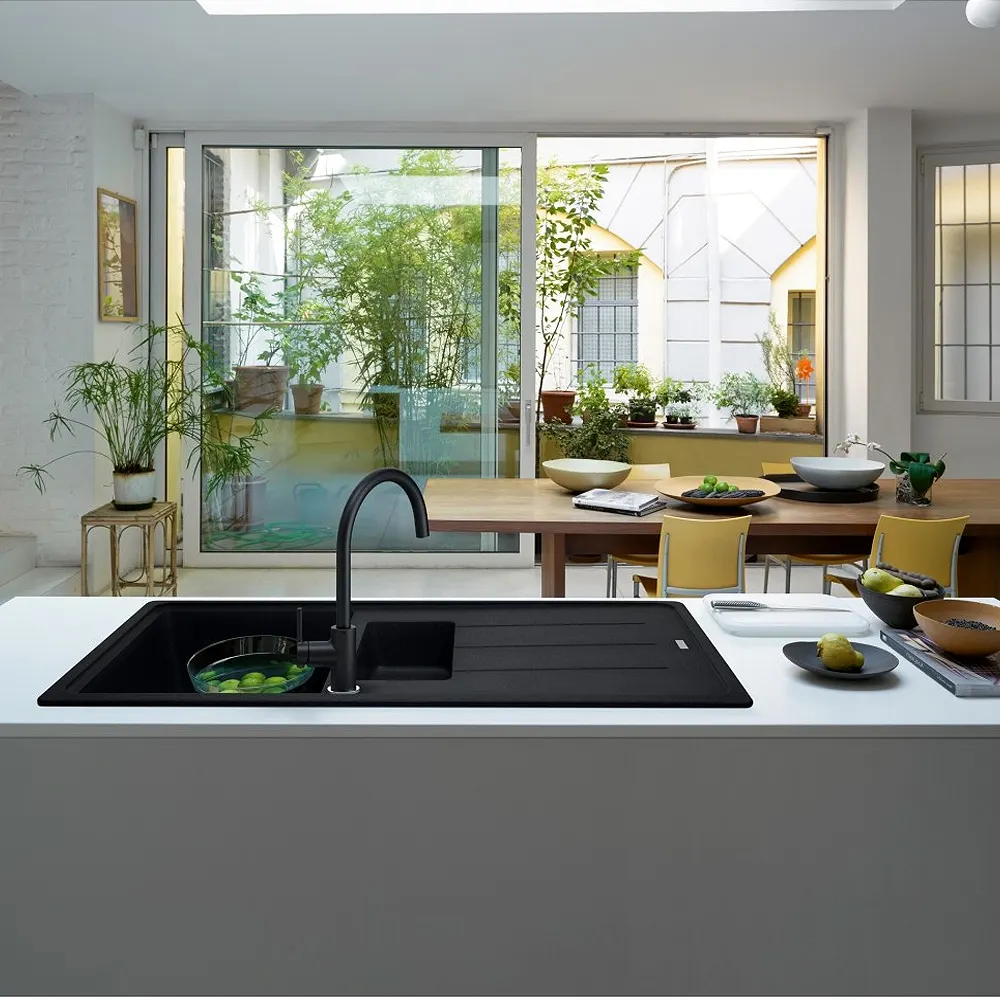 Bateria de bucătărie Franke Pola 2.0 în finisaj negru mat oferă un echilibru perfect între estetică și funcționalitate. Pipa înaltă, în formă de lebădă, asigură confort în utilizare, fiind ideală pentru vase mari și activități zilnice în bucătărie.