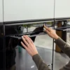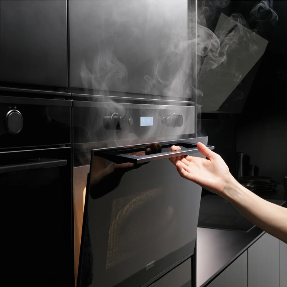 Designul elegant, cu sticlă neagră și inox, se integrează perfect în bucătăriile moderne.