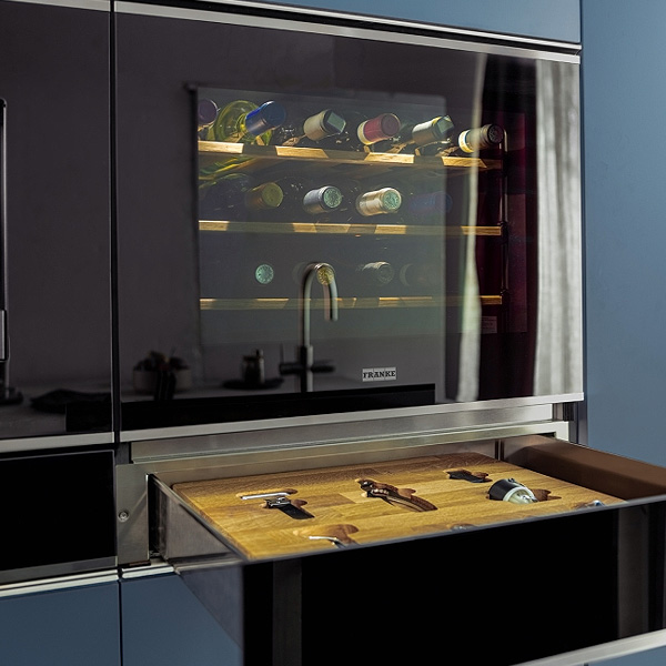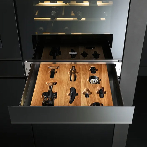 Setul de accesorii Franke FMY 14 WCRD este soluția ideală pentru pasionații de vin care doresc un spațiu complet echipat. Sertarul încorporabil elegant este disponibil în culoare neagră sau într-o combinație de negru și oțel inoxidabil, cu un insert din lemn natural. Setul face parte din colecția Mythos și este perfect compatibil cu electrocasnicele Franke.