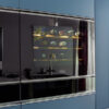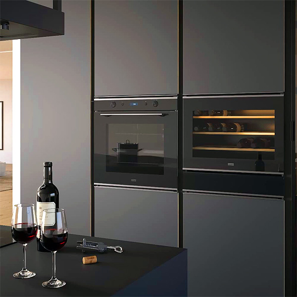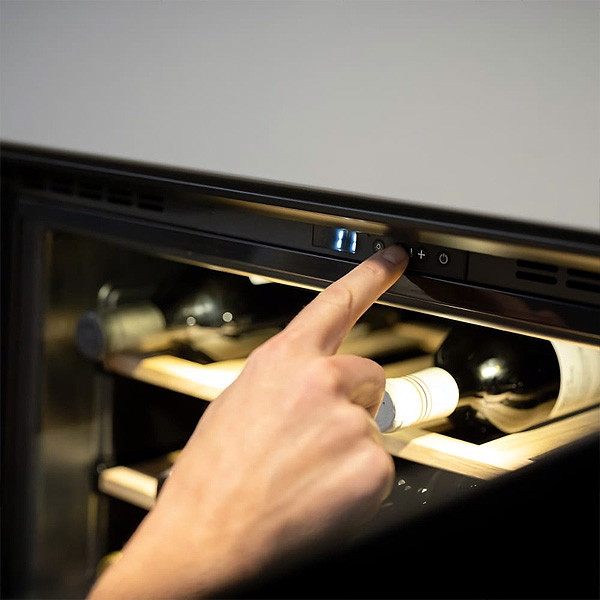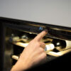 Ușa din sticlă fumurie protejează vinul de radiațiile UV, iar rafturile din lemn natural reduc vibrațiile. Sistemul Push-to-open permite deschiderea ușii printr-o simplă apăsare – ideal pentru instalare fără mâner.