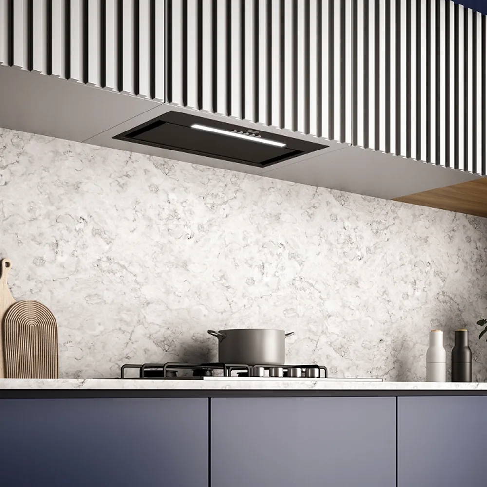 Hota este proiectată pentru instalare completă în dulap, la nivel cu mobilierul, ascunzând elementele de fixare și oferind un aspect curat și minimalist. Înălțimea minimă de montaj de 45 cm permite flexibilitate în proiectarea spațiului.
