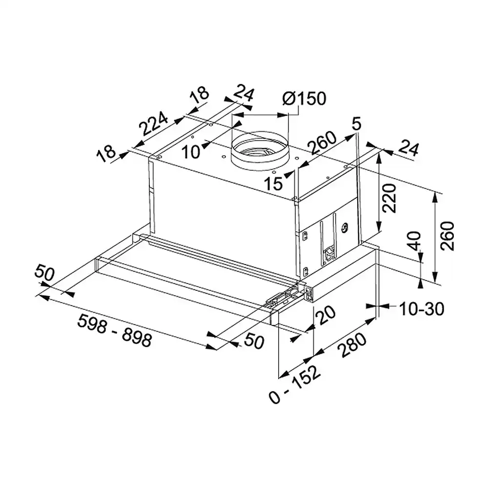 Construcția pull-out permite extinderea hotei în timpul utilizării și integrarea discretă în mobilier atunci când nu este folosită.