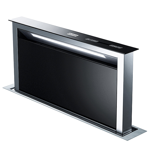 Hota Franke FDW 908 IB XS Cristallo Nero/Inox cu un design elegant din sticlă neagră și oțel inoxidabil.