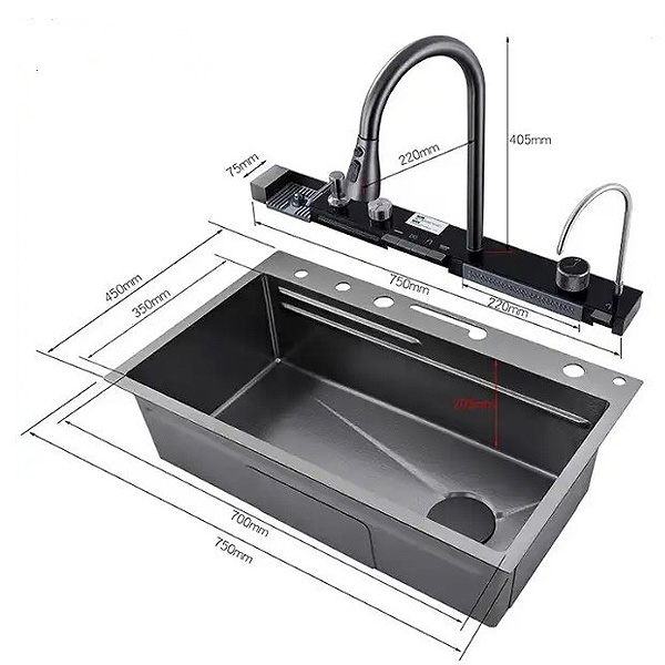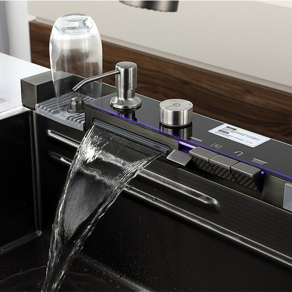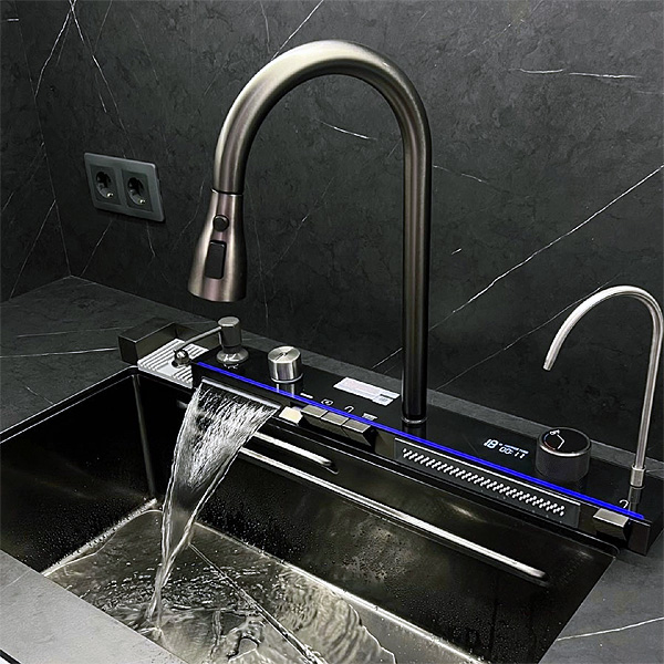 В комплект входят: раковина, консоль с дисплеем, выдвижной смеситель с тремя режимами, два водопадных смесителя, дозатор, омыватель бокалов и кран для фильтрованной воды. Глубокая чаша (22 см) обеспечивает удобство при мытье посуды. Надёжность конструкции подтверждена гарантией 24 месяца.