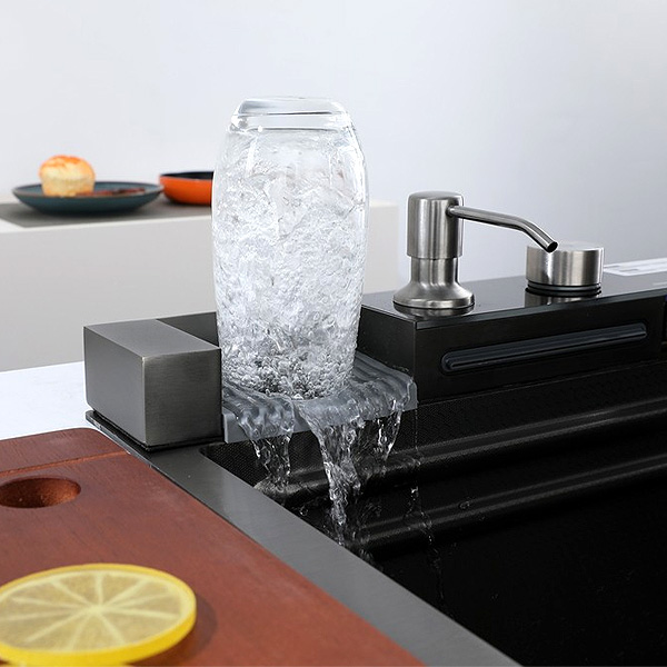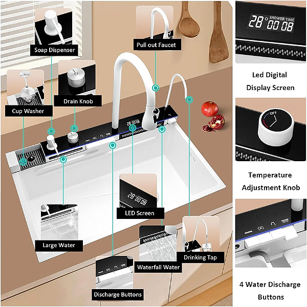 В комплект входят: раковина, консоль с дисплеем, выдвижной смеситель с тремя режимами, два водопадных смесителя, дозатор, омыватель бокалов и кран для фильтрованной воды. Глубокая чаша (22 см) обеспечивает удобство при мытье посуды. Надёжность конструкции подтверждена гарантией 24 месяца.